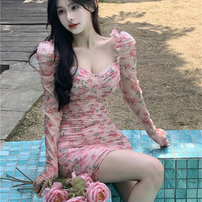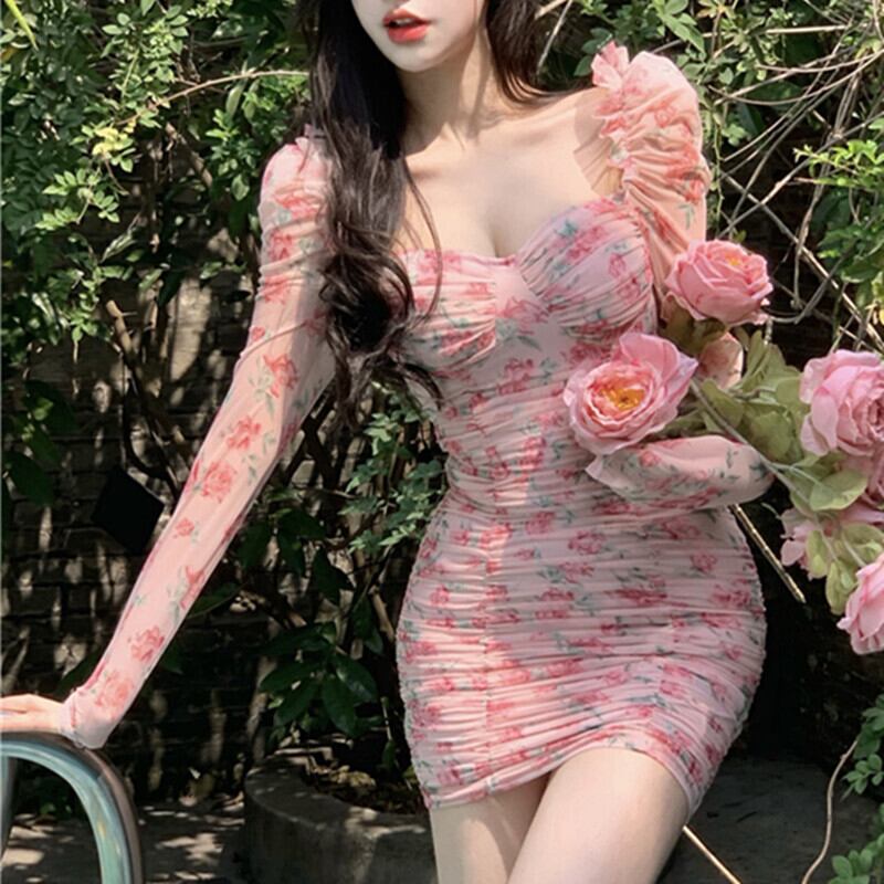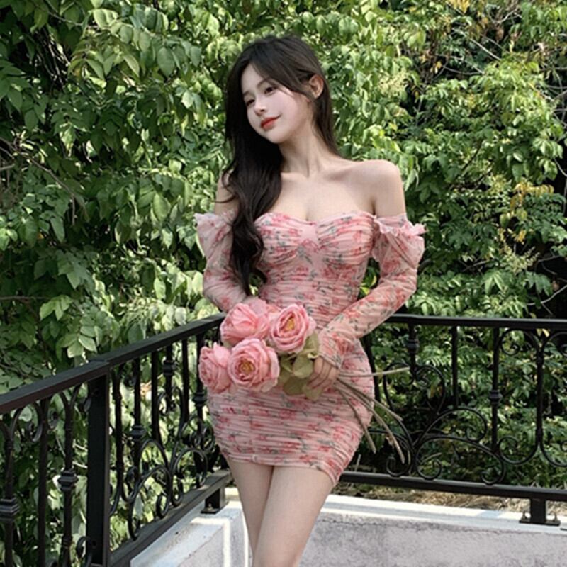 ワンピース セクシー ボートネックデザイン 花柄 魅せられる 人気満々 ピンク S M