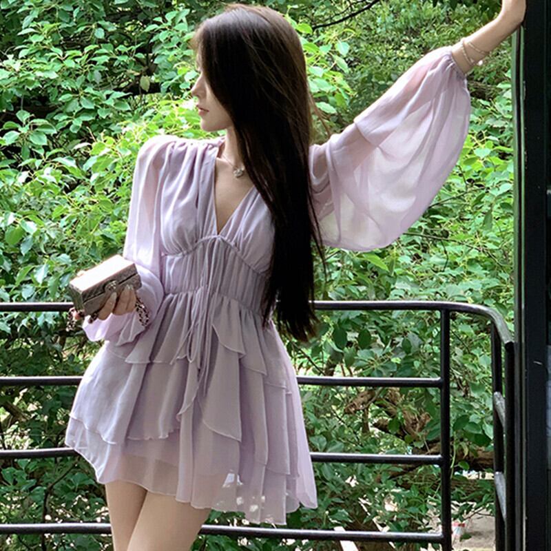 ワンピース セクシー Vネック シフォン ペプラム ランタンスリーブ パープル S M L