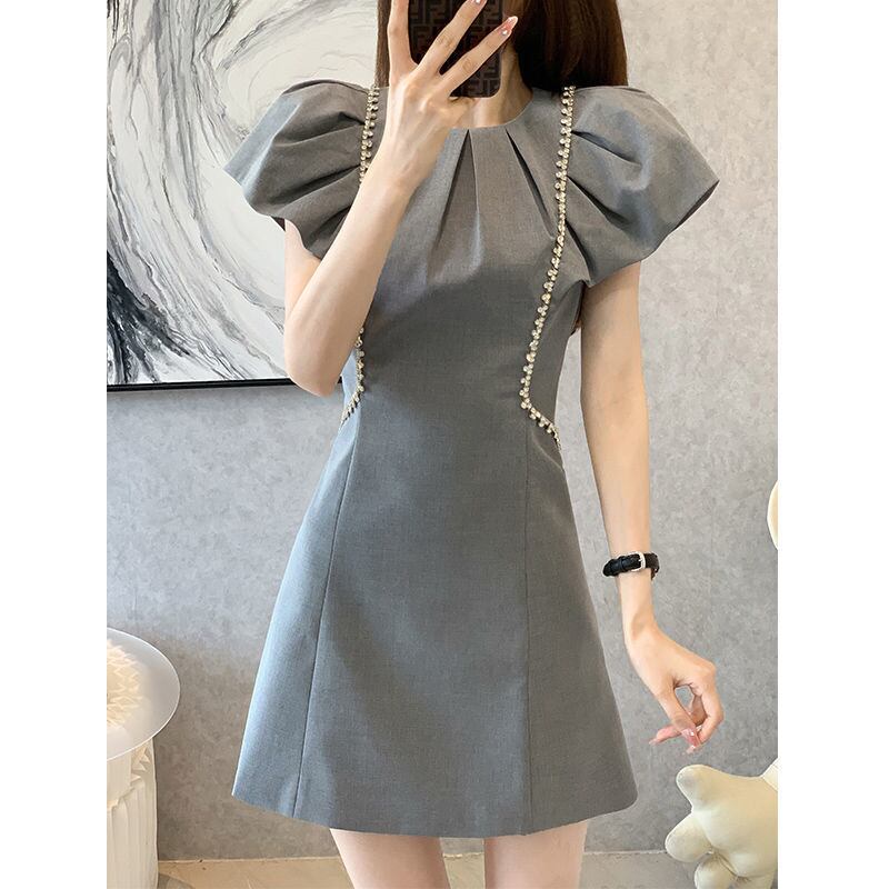 【森森家シリーズ】ワンピース ラウンドネック 肩パフ 大きいサイズ Aライン グレー S M L XL 2XL