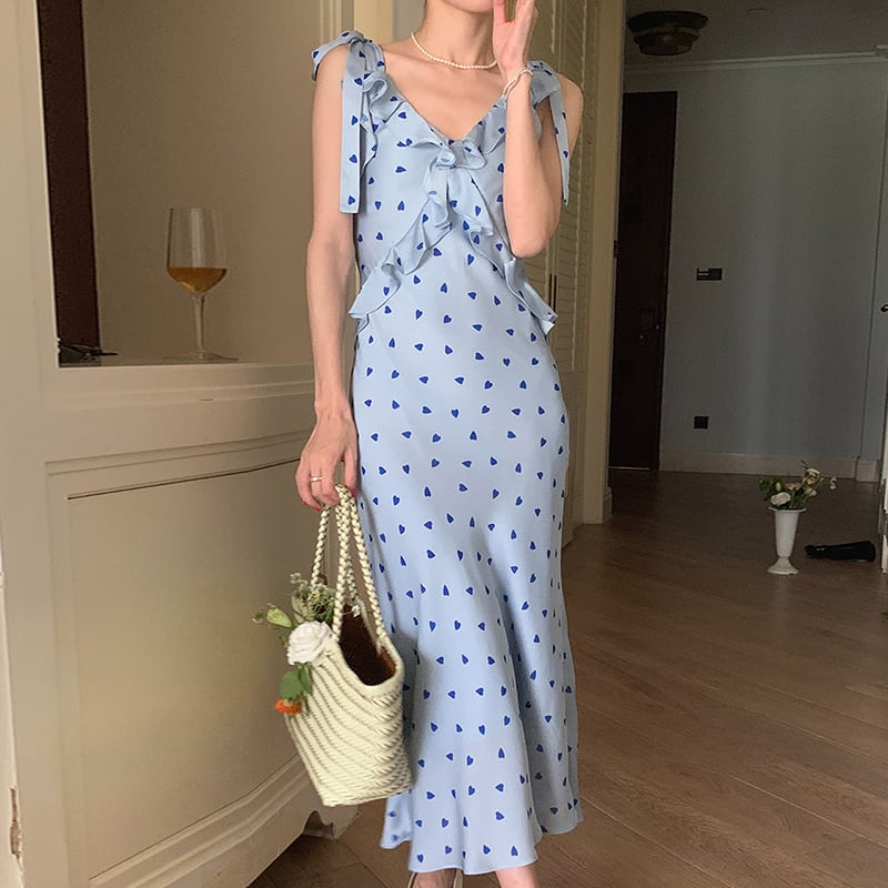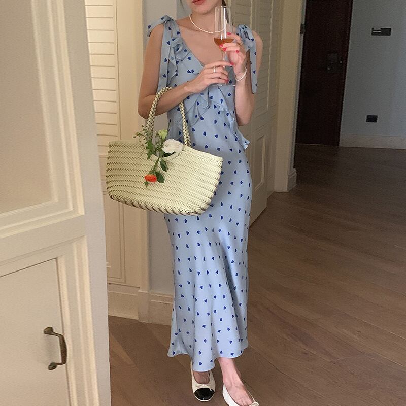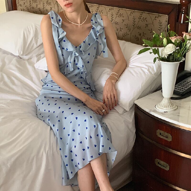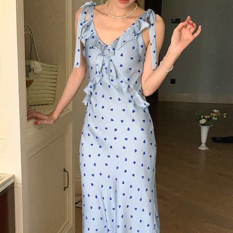 吊りワンピース 2色展開 ペプラム 水色 ハート柄 ブルー ベージュ S M