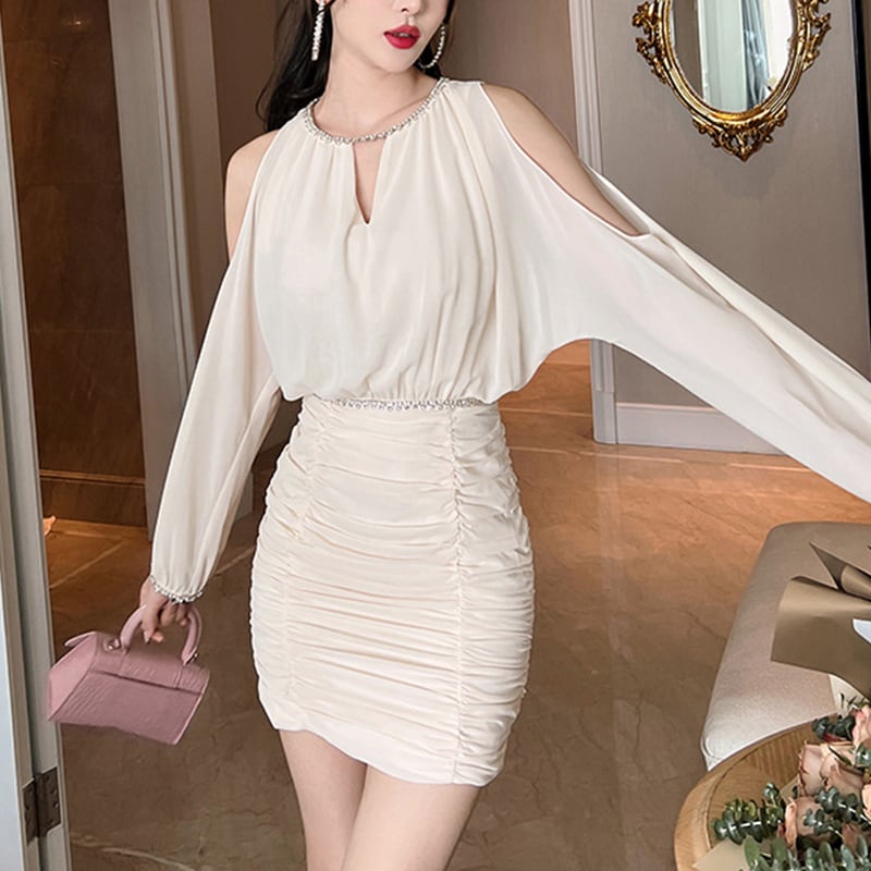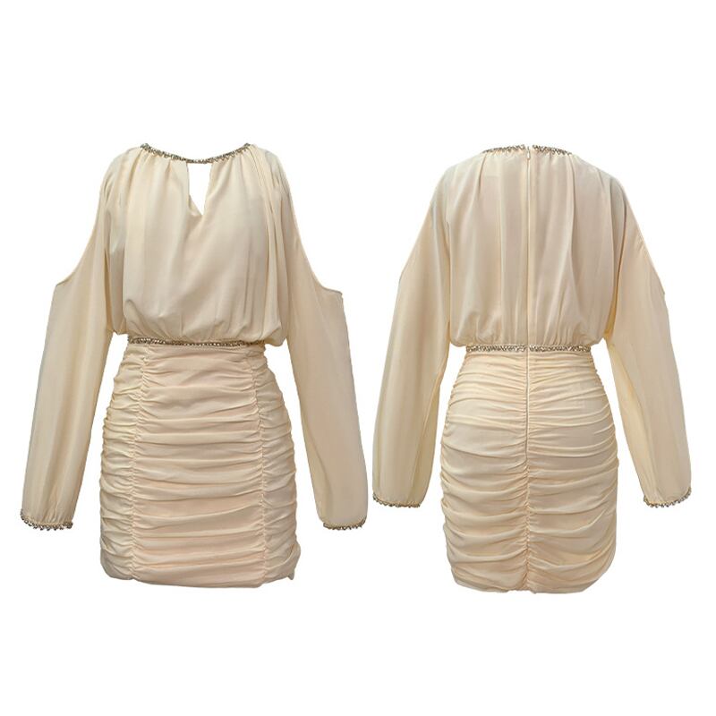 【夕暮薔薇シリーズ】ワンピース 長袖 肩見せ セクシー 熟女 ラインストーン ベージュ S M L XL