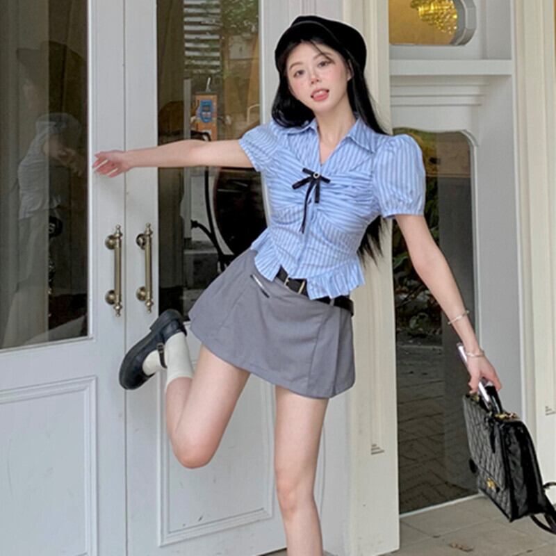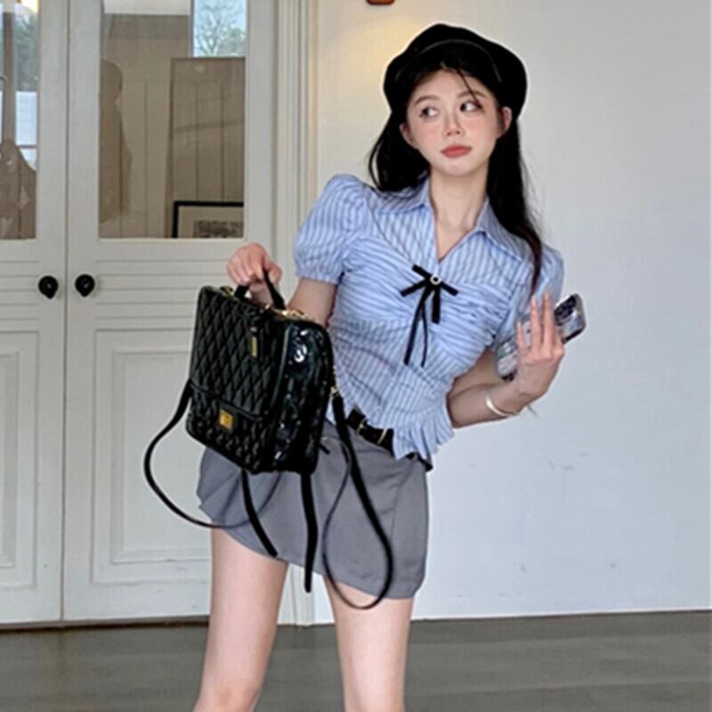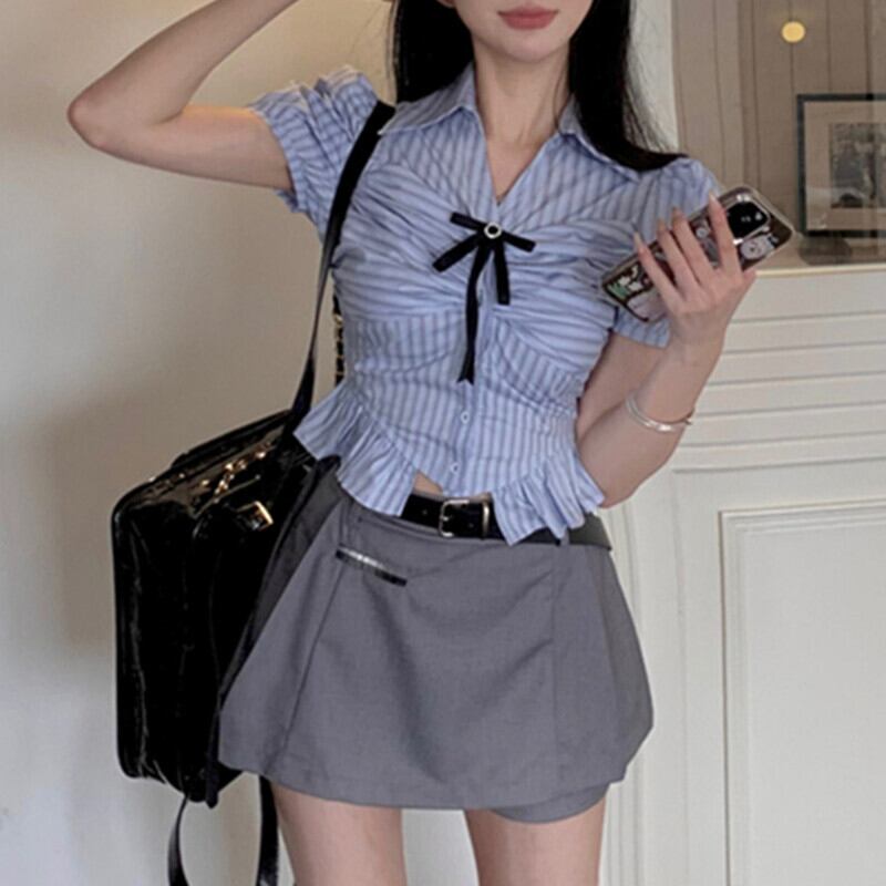セットアップ シャツ+スカート 2点セット カジュアル 学園風 ストライプ柄 S M