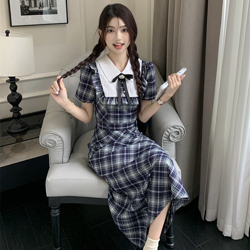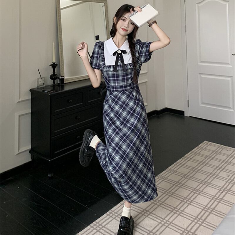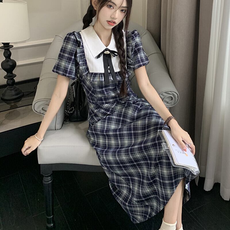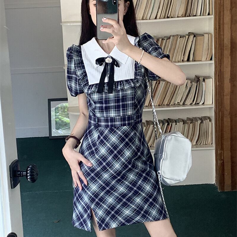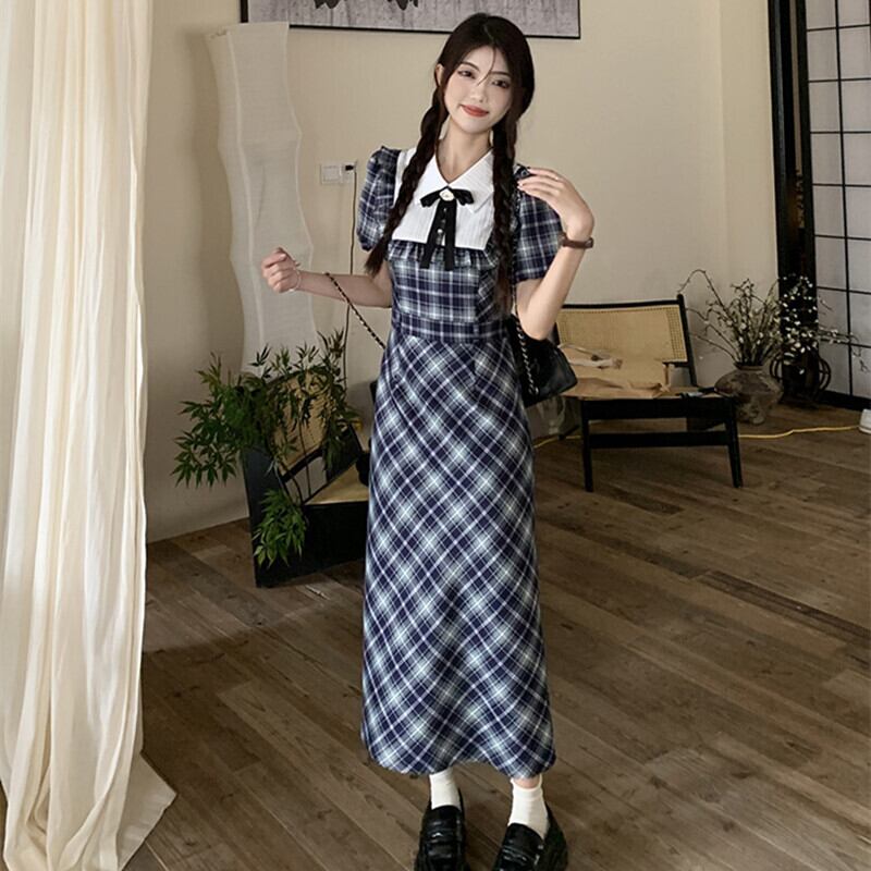 ワンピース カジュアル チェック柄 通勤 半袖 パフスリーブ S M L