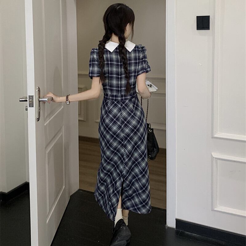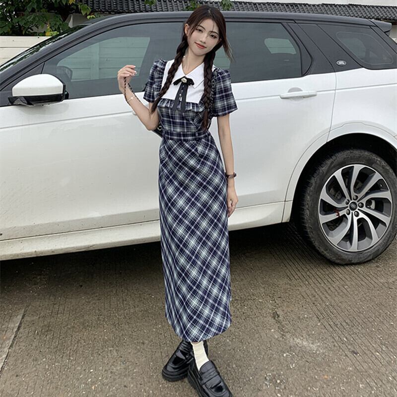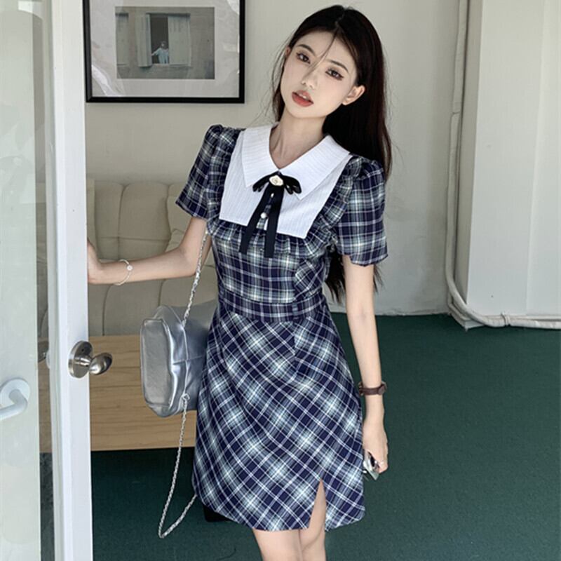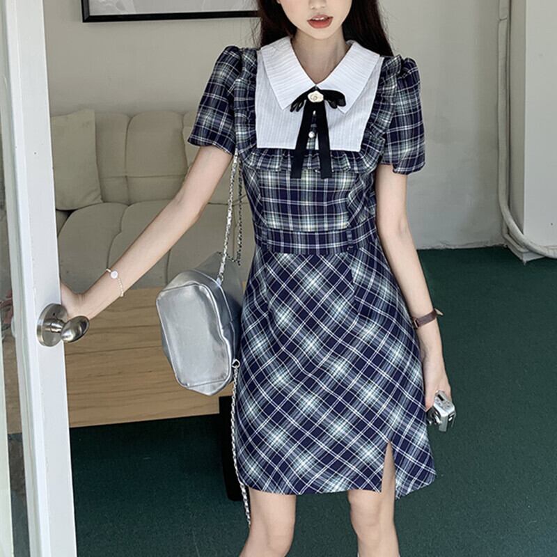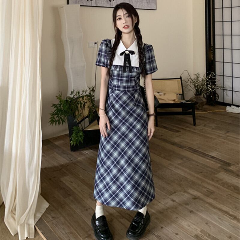 ワンピース カジュアル チェック柄 通勤 半袖 パフスリーブ S M L
