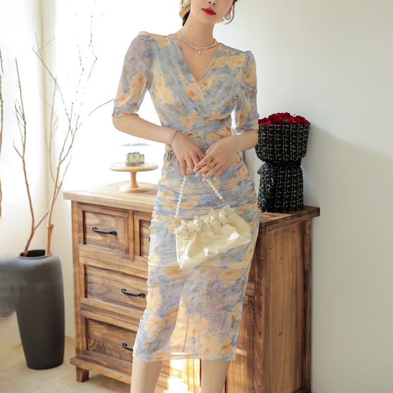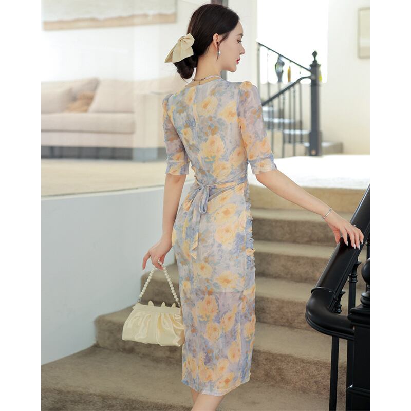 【夕暮薔薇シリーズ】ワンピース 気質UP 優しい 花柄 中袖 Vネック S M L XL