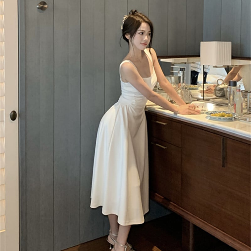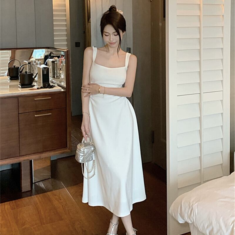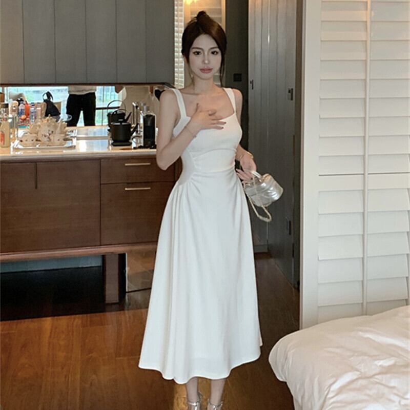 ワンピース セクシー シンプル スクエアネック ノースリーブ ホワイト S M