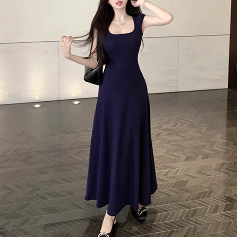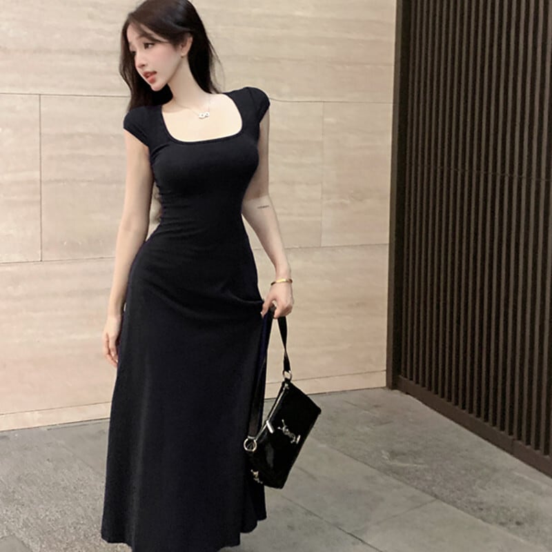 ワンピース セクシー 合わせやすい ロング丈 スクエアネック ネイビー ブラック グレー