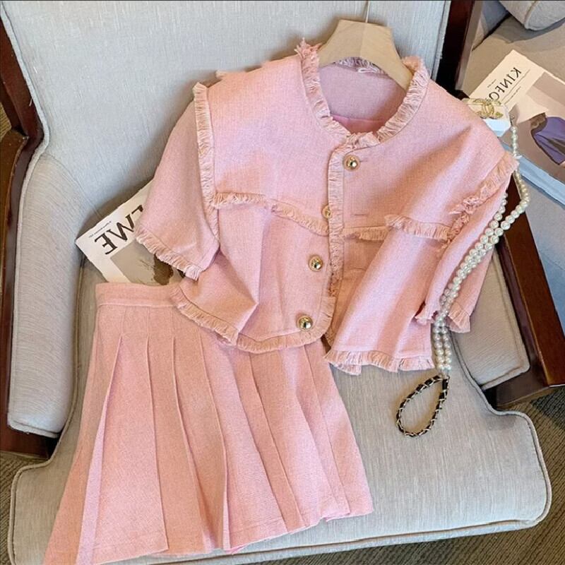 【YOYOシリーズ】セットアップ トップス+スカート ツイード 無地 大きいサイズ ピンク S M L XL 2XL