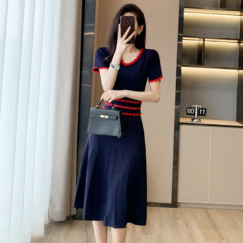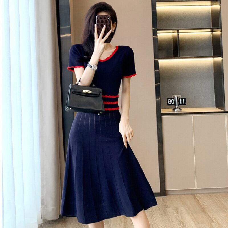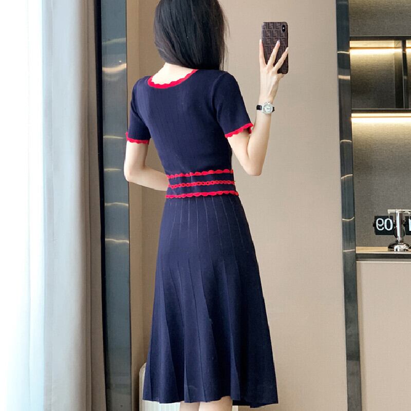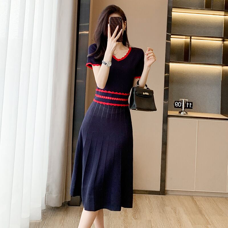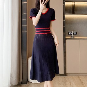 【森森家シリーズ】ワンピース ニット 配色 エレガント Vネック ダークブルー S M L XL