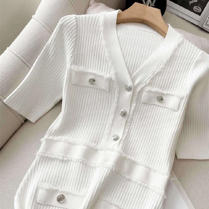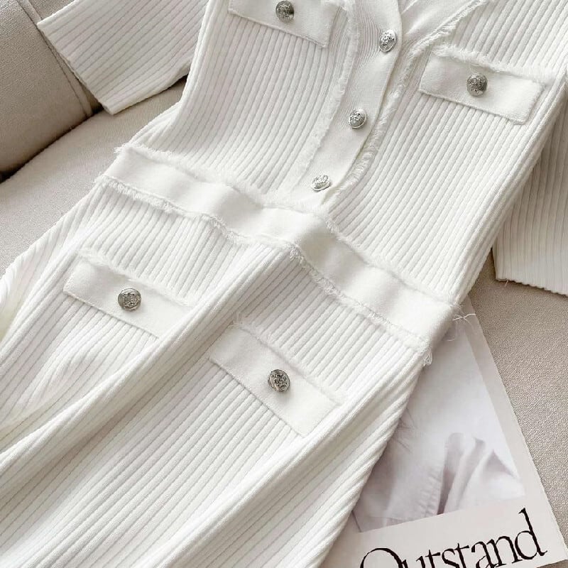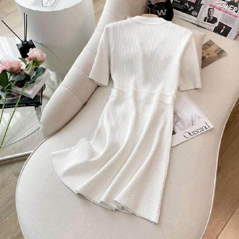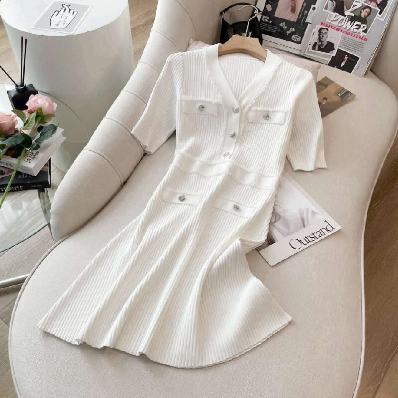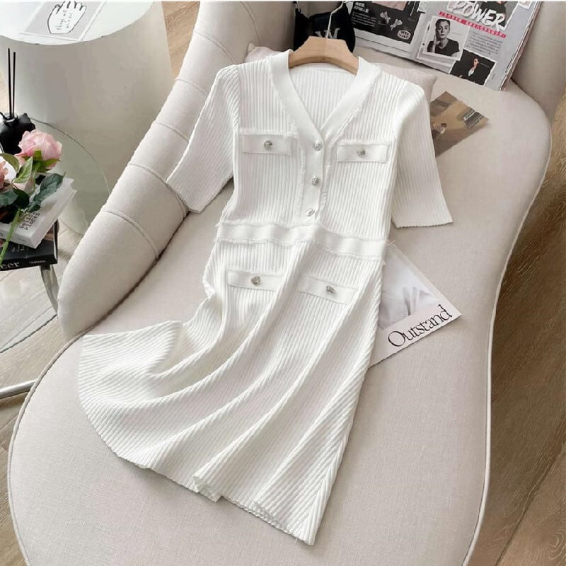 【森森家シリーズ】ワンピース ニット 白 Aライン Vネック ホワイト S M L XL