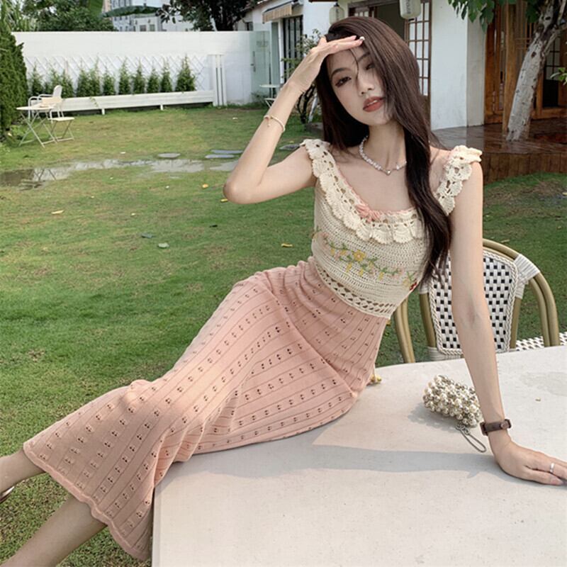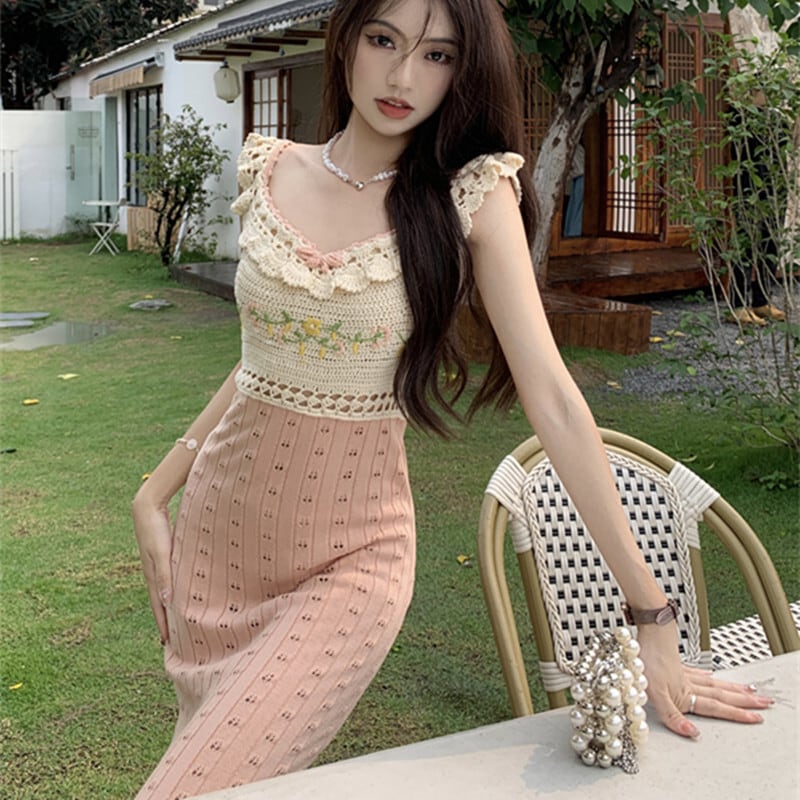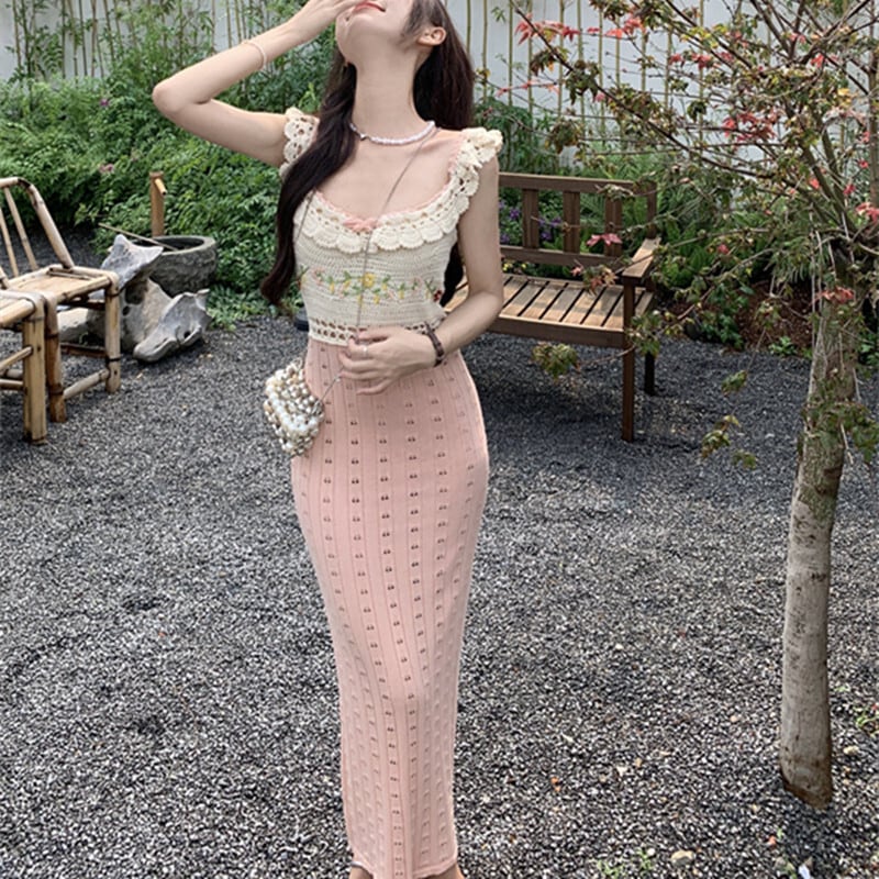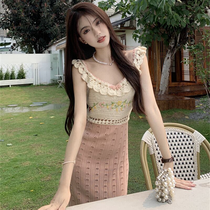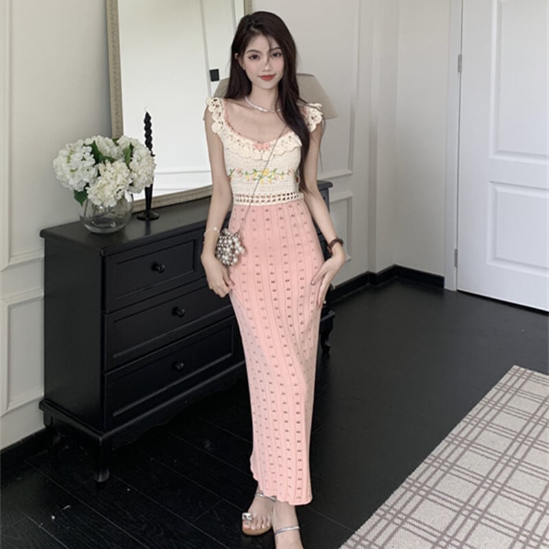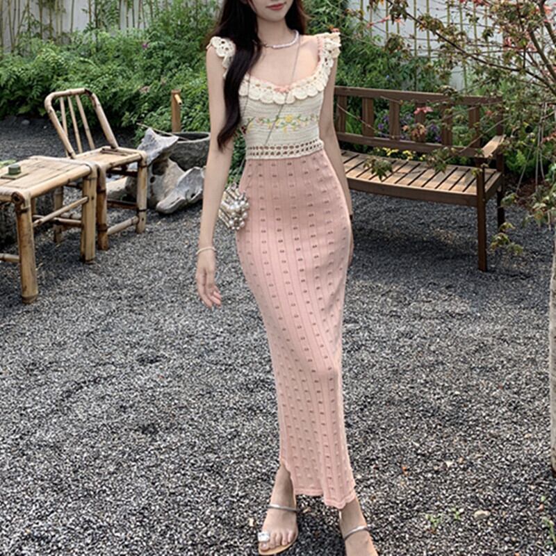 ワンピース ニット 配色 セクシー 切り替え ロング丈 ノースリーブ S M