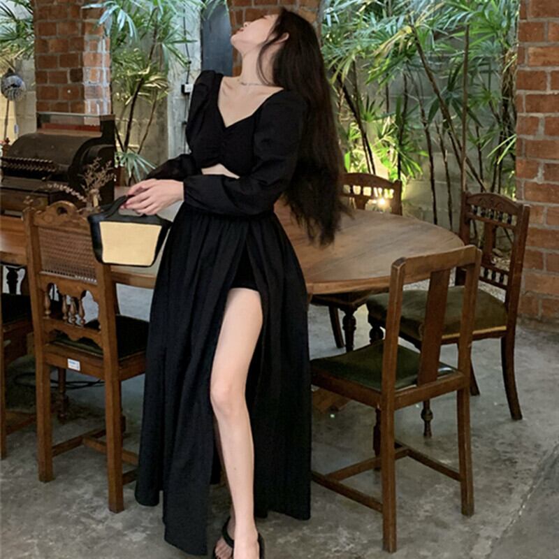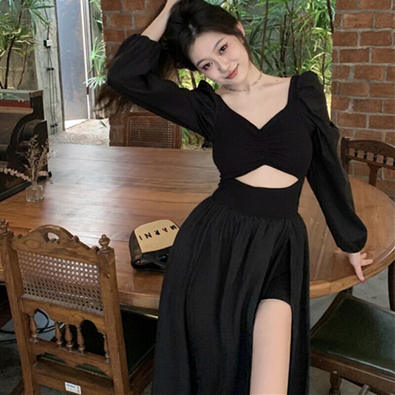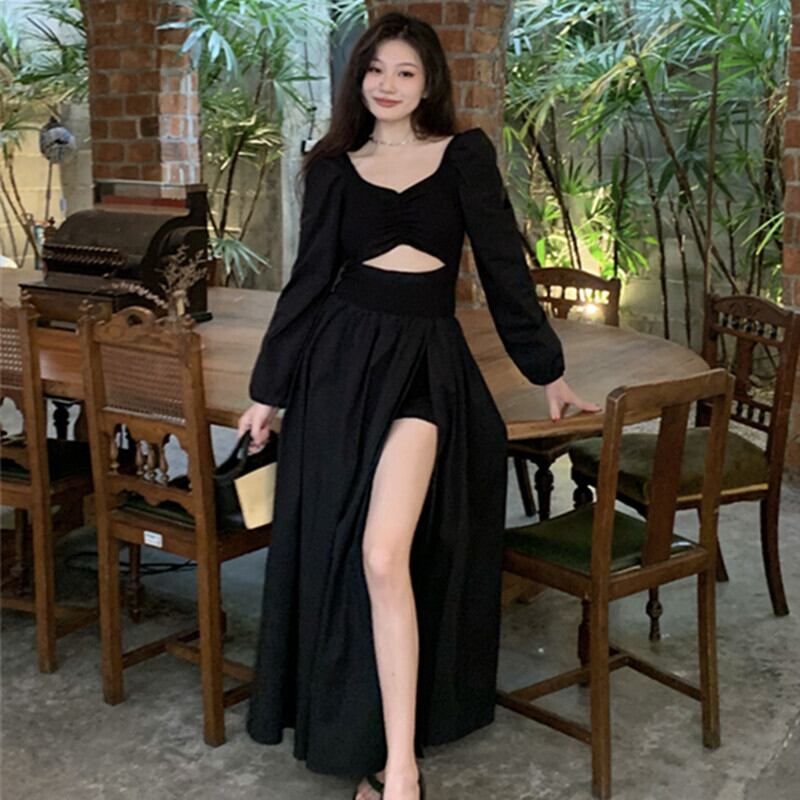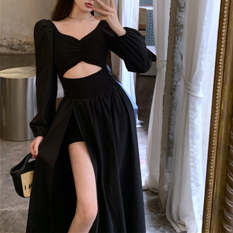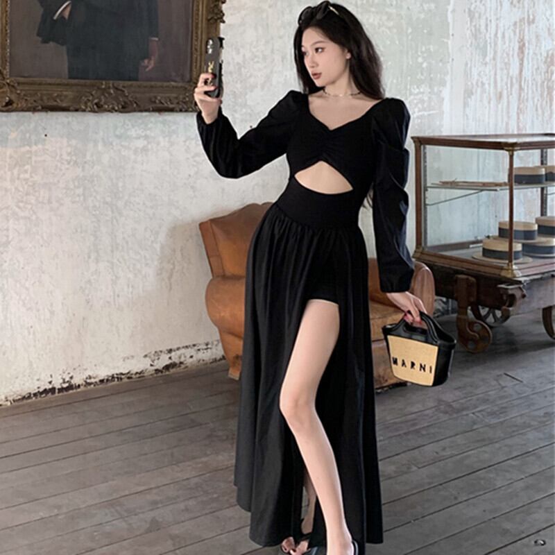 ワンピース セクシー おしゃれ 長袖 スリット Vネック ブラック S M L