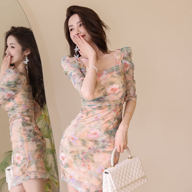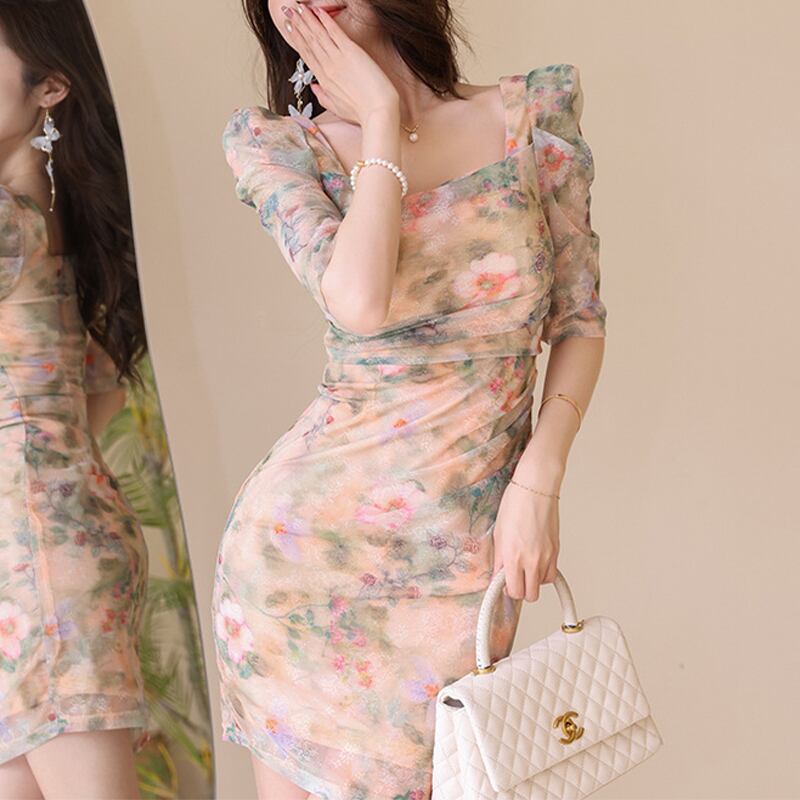 【夕暮薔薇シリーズ】ワンピース セクシー 優雅 花柄 スクエアネック 清新 大きいサイズ S M L XL 2XL