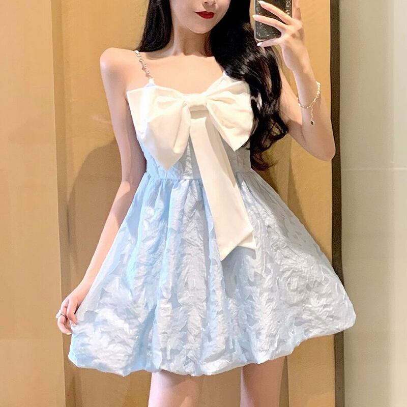 ワンピース デザイン感 かわいい 蝶結び Aライン 吊りワンピース ブルー ブラック ホワイト S M L