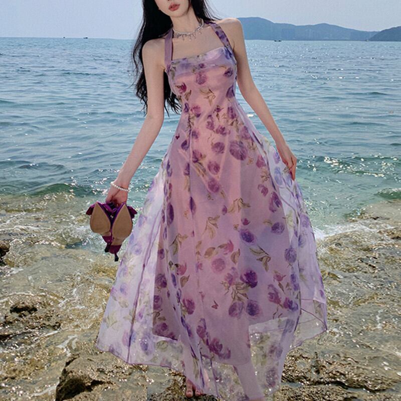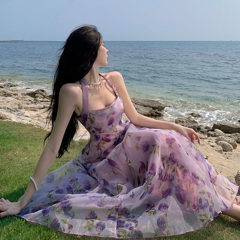 ワンピース セクシー 女性らしい エレガント 一目惚れ 花柄 パープル S M L XL