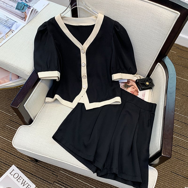 【YOYOシリーズ】セットアップ 元気いっぱい OL/通勤 トップス+ パンツ 大きいサイズ ブラック L XL 2XL 3XL 4XL