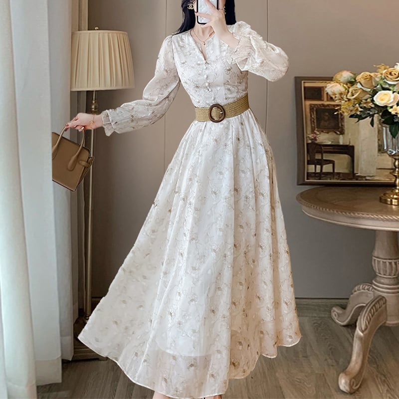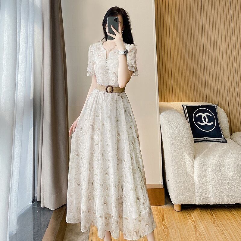 【Aivimoシリーズ】ワンピース ベルト付き 文芸風 清新 花柄 シフォン ロング丈 半袖&長袖 大きいサイズ ベージュ S M L XL 2XL