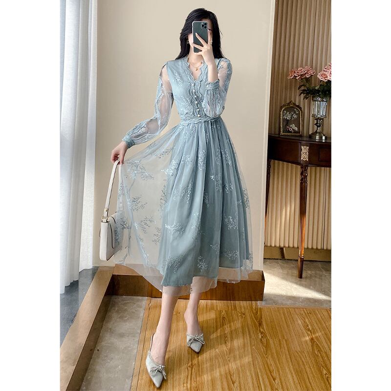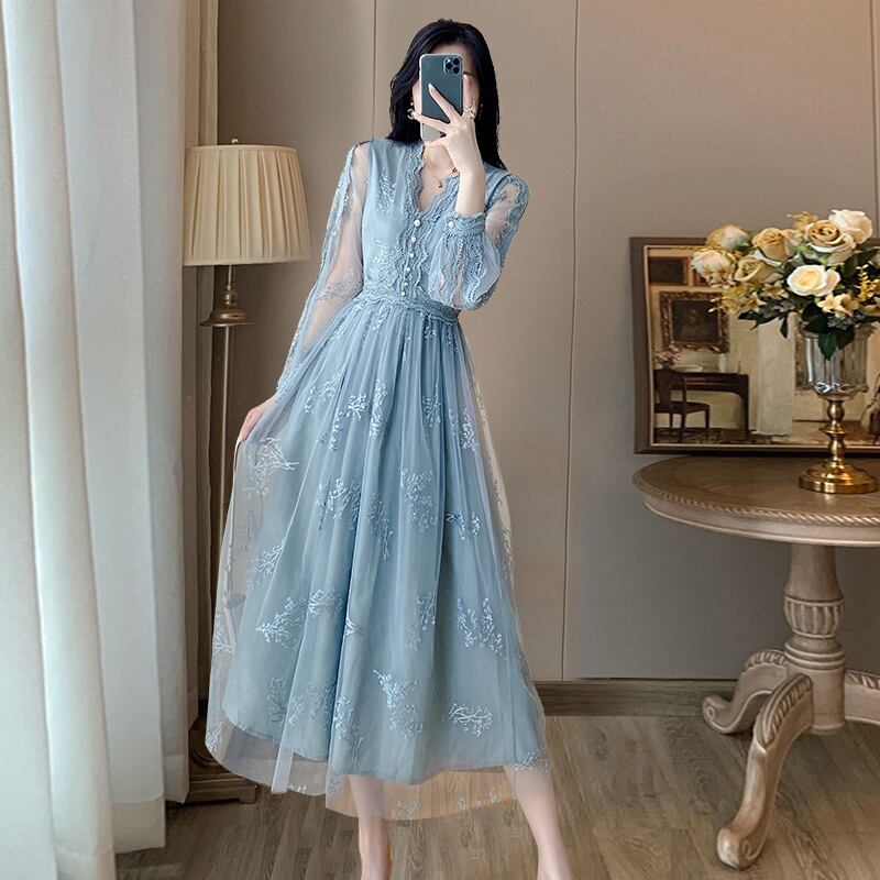 【Aivimoシリーズ】ワンピース 文芸風 清新 レース Vネック ロング丈 長袖 大きいサイズ ブルー S M L XL 2XL
