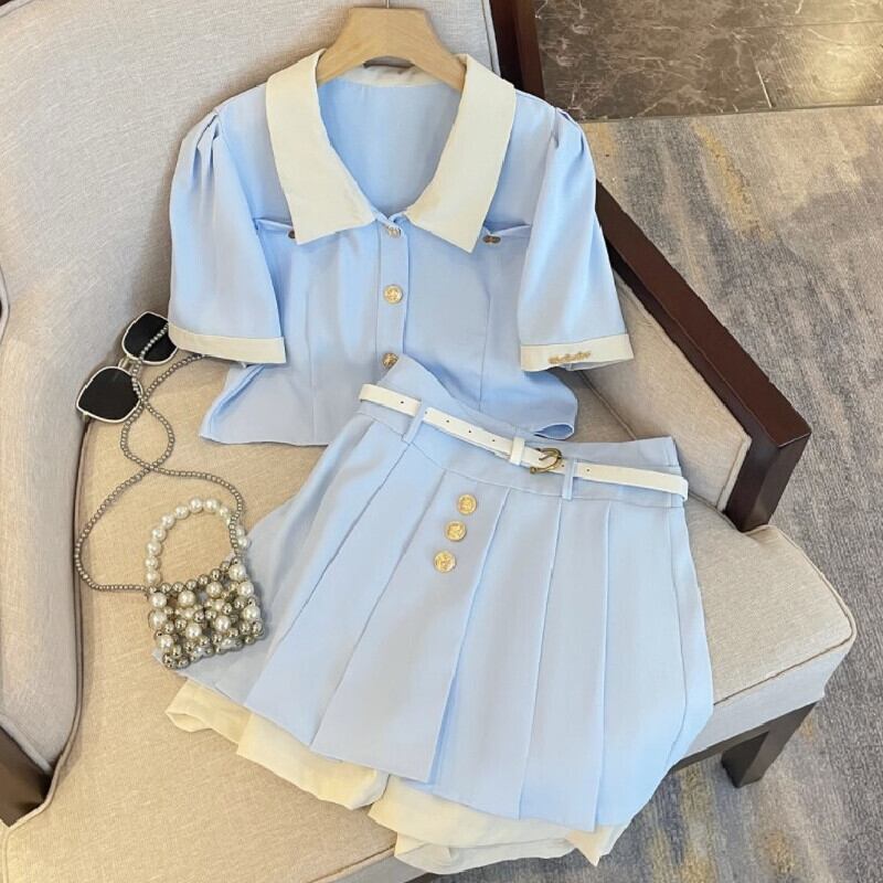 【YOYOシリーズ】セットアップ トップス+ショートパンツ POLOネック 水色 エレガント ブルー S M L XL