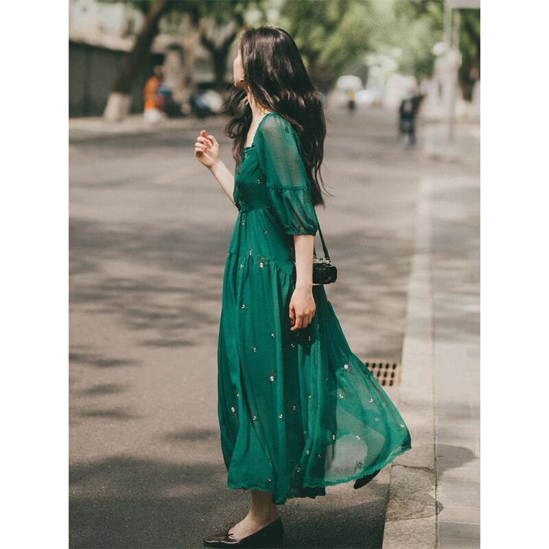 ワンピース OL/通勤 文芸風 スクエアネック ロング丈 大きいサイズ グリーン L XL 2XL 3XL 4XL