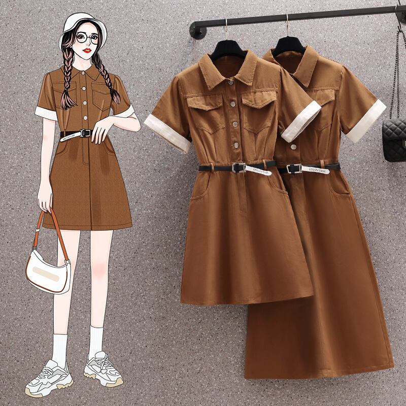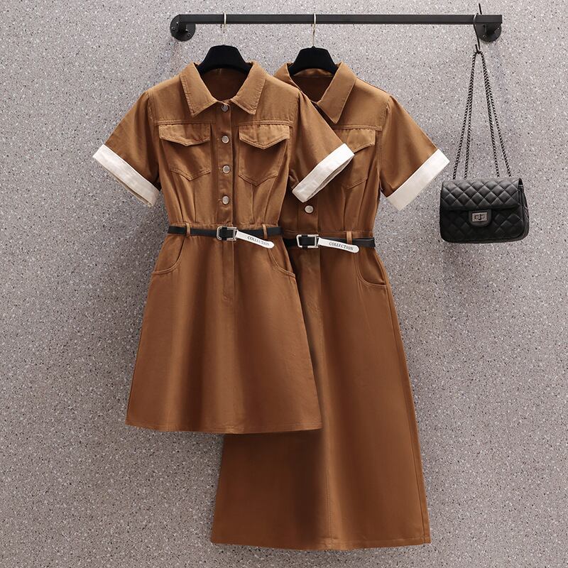 【YOYOシリーズ】ワンピース ベルト付き OL/通勤 Aライン デニム ロング丈&シュート丈 大きいサイズ ブラウン M L XL 2XL 3XL 4XL