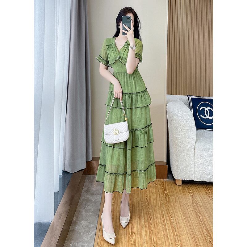 【Aivimoシリーズ】ワンピース 清新 ティアード Vネック ロング丈 半袖 大きいサイズ グリーン S M L XL 2XL