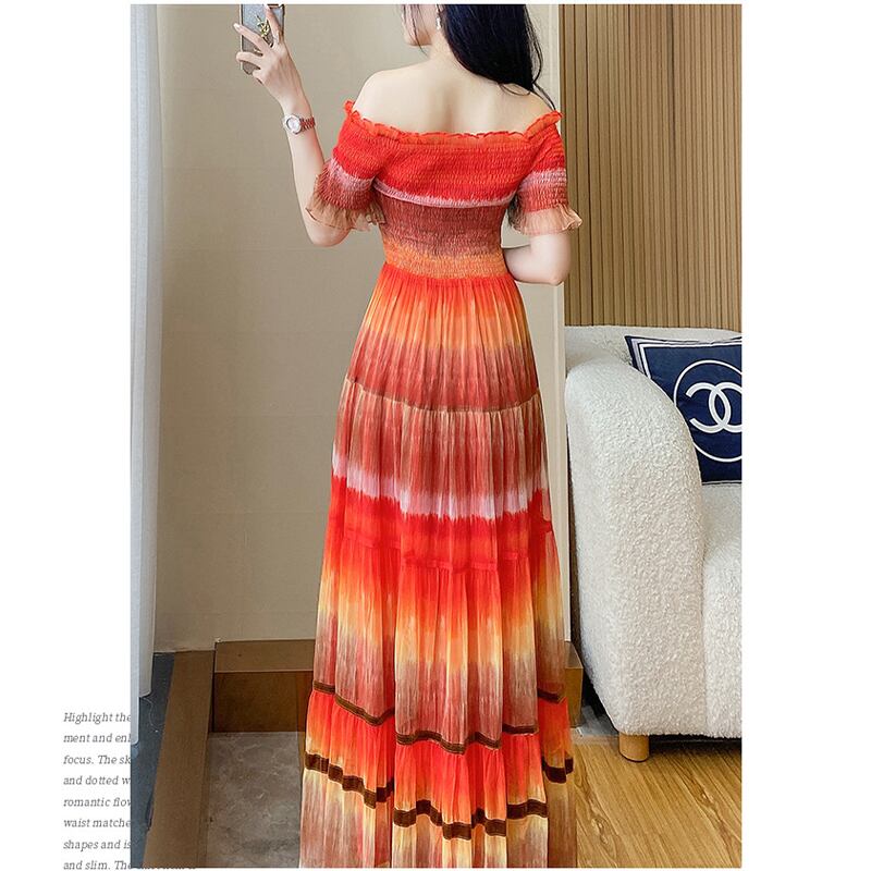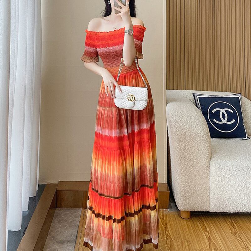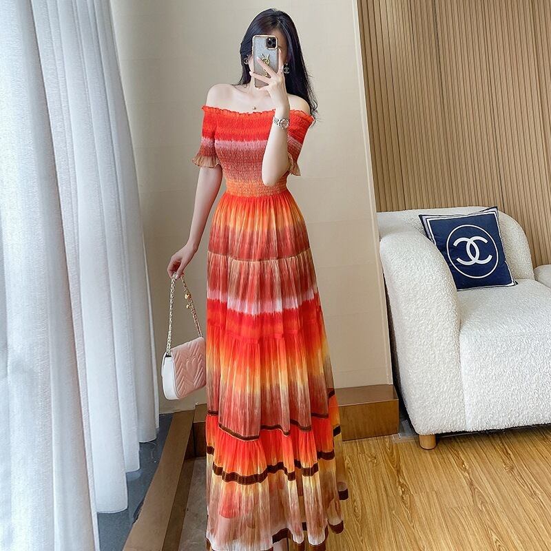 【Aivimoシリーズ】ワンピース デザイン感 シフォン ボートネック ボーダー ロング丈 大きいサイズ レッド S M L XL 2XL