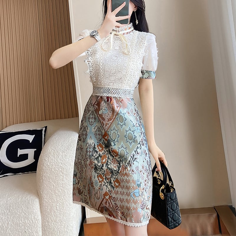 【Aivimoシリーズ】ワンピース レトロ 気質UP OL/通勤 レース 切り替え 半袖 大きいサイズ S M L XL 2XL