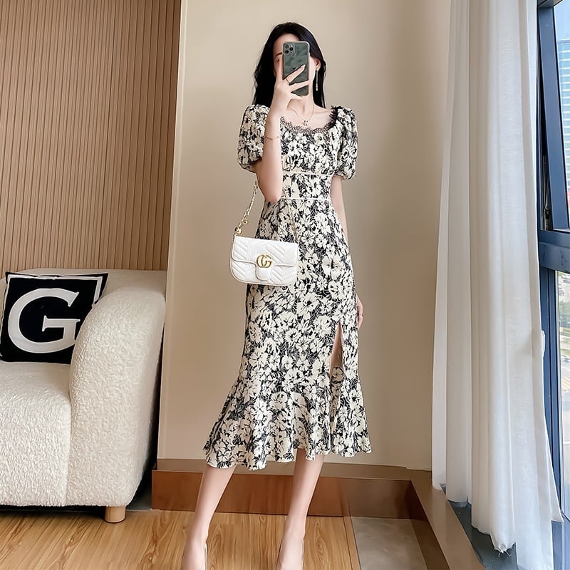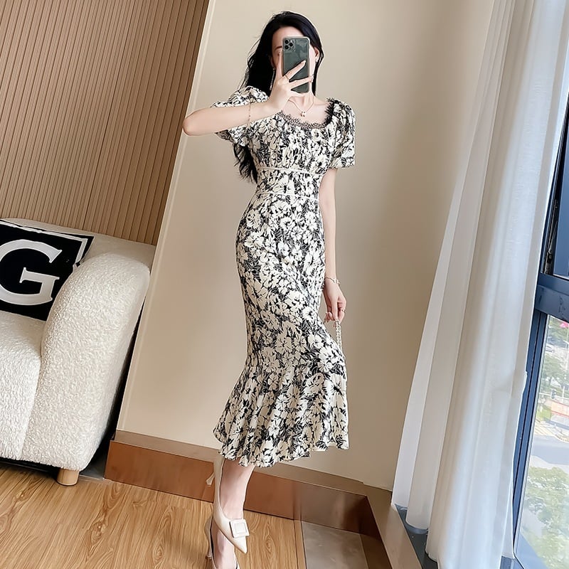 【Aivimoシリーズ】ワンピース デザイン感 花柄 ロング丈 半袖 大きいサイズ ブラック S M L XL 2XL