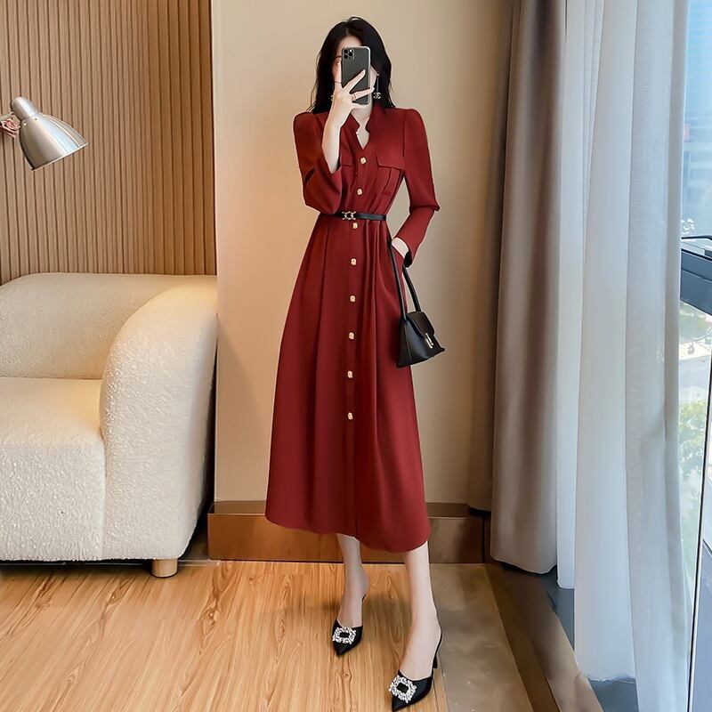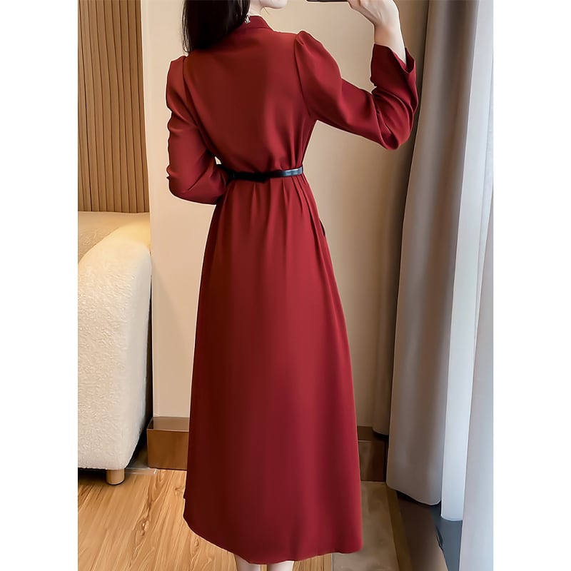 【Aivimoシリーズ】ワンピース OL/通勤 ゴージャス ベルト付き シフォン ロング丈 大きいサイズ ワインレッド S M L XL 2XL