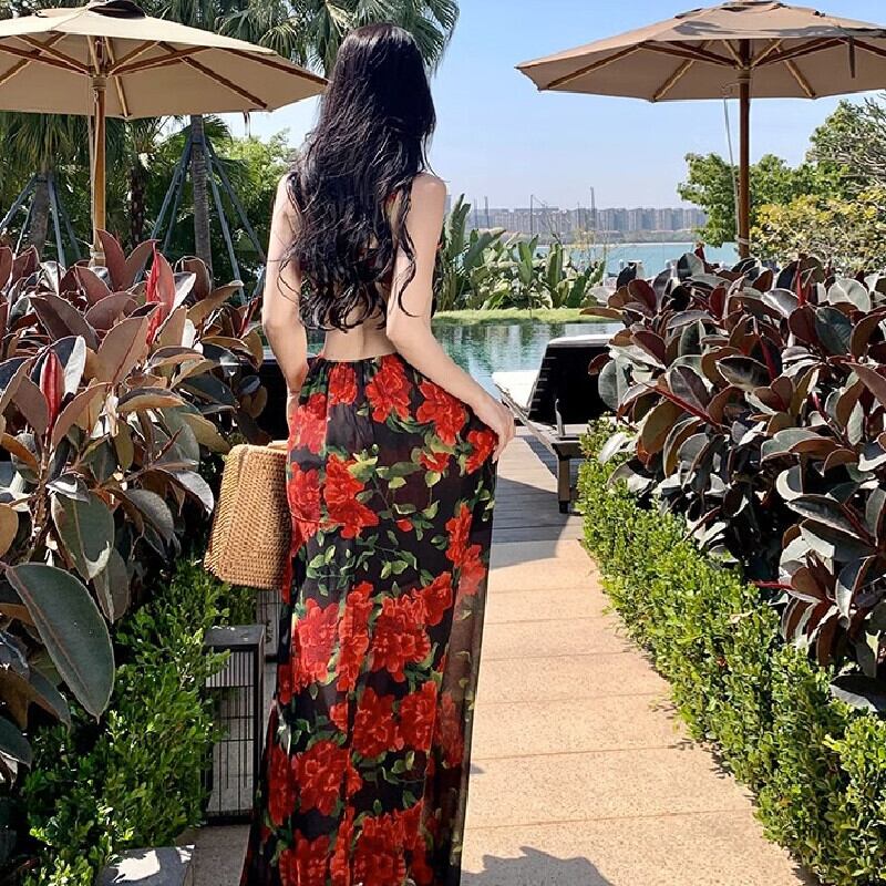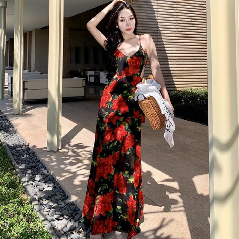 【SummerVacationシリーズ】吊りワンピース レトロ 花模様 ロング丈 ブラック+レッド S M L XL