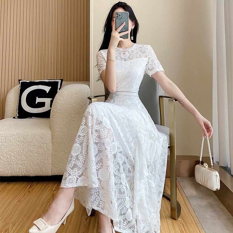 【Aivimoシリーズ】ワンピース 透かし彫り清新 レース ロング丈 大きいサイズ ホワイト S M L XL 2XL