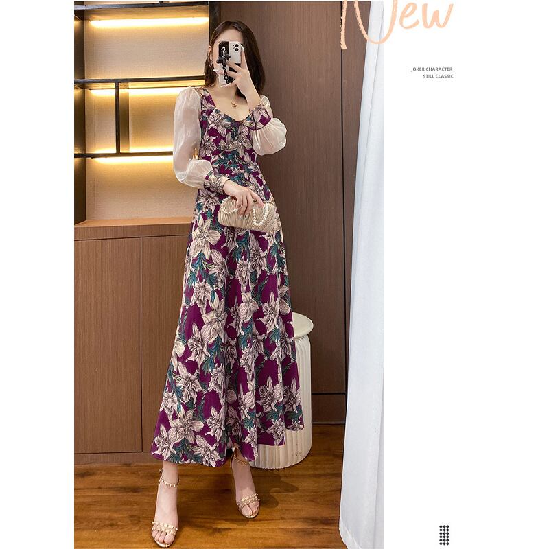 【Aivimoシリーズ】ワンピース レトロ 切り替え ロング丈 花柄 大きいサイズ レッド パープル S M L XL 2XL