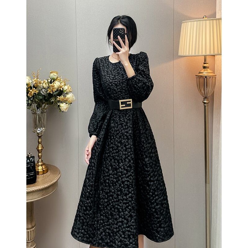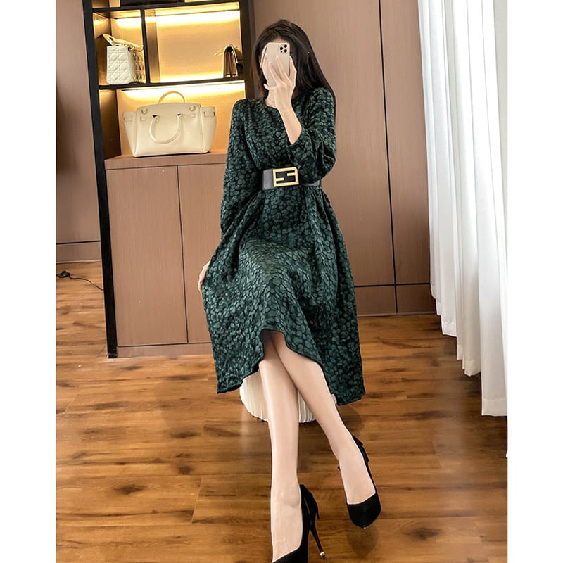 【Aivimoシリーズ】ワンピース ベルト付き Aライン ロング丈 ブラック ダークグリーン S M L XL