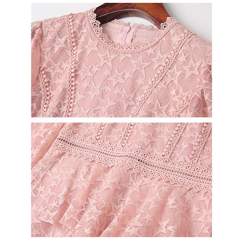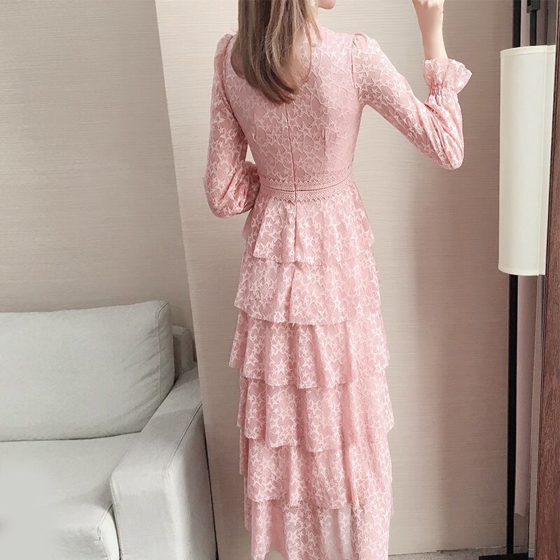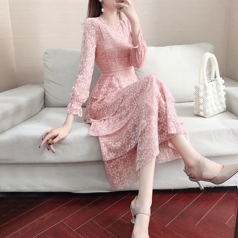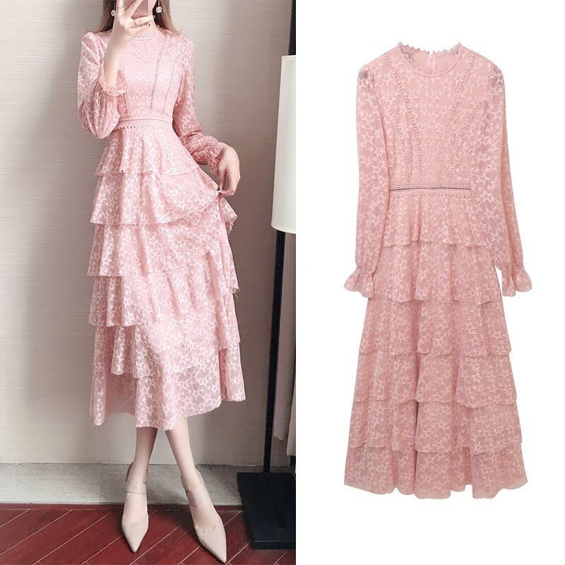 ワンピース スウィート 長袖 レース フィッシュテール ピンク S M L XL