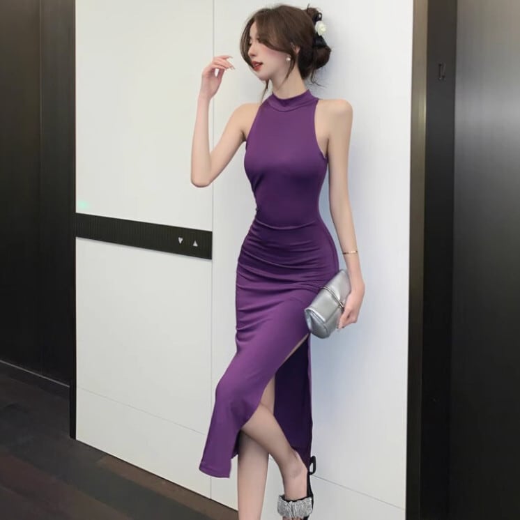 【CHERRYシリーズ】 ロングワンピース ノースリーブ 無地 サイドスリット パープル S M L