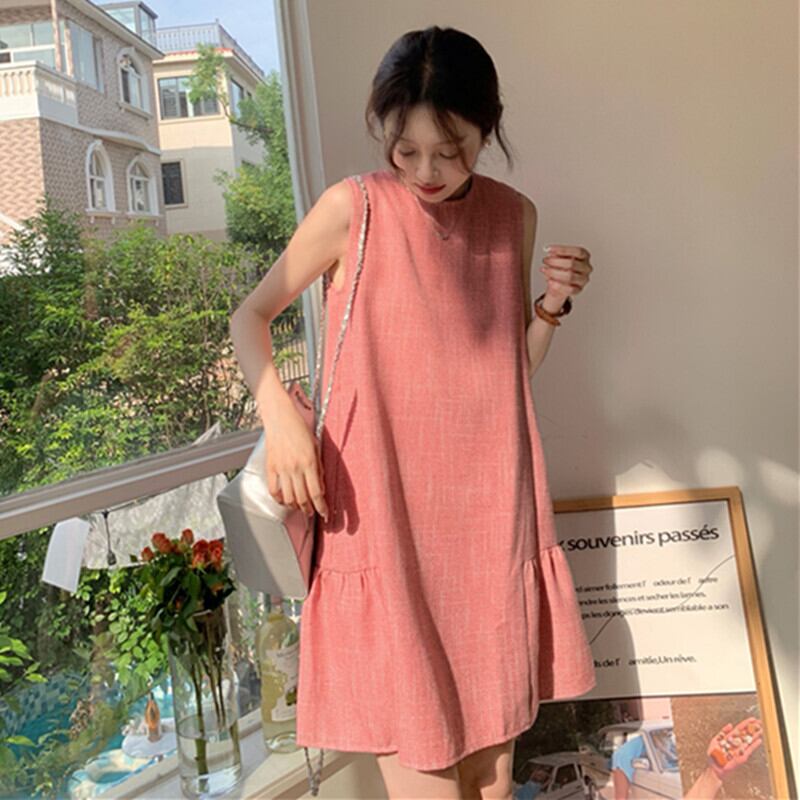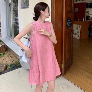 ワンピース カジュアル ラウンドネック ノースリーブ ツイード ピンク S M L
