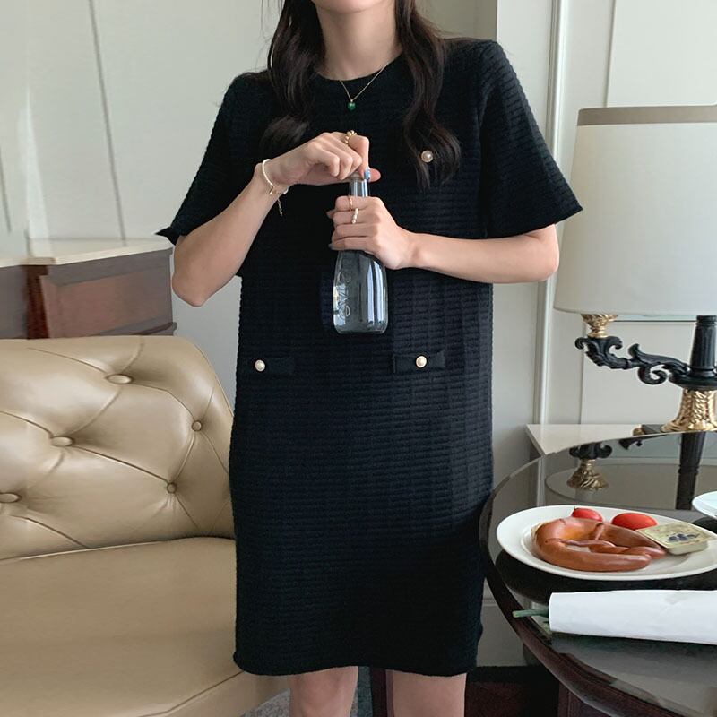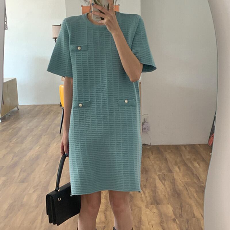 ワンピース ツイード 半袖 ラウンドネック カジュアル ブルー レッド ブラック アプリコット