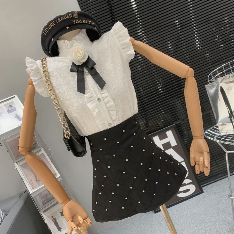 【Airi Styleシリーズ】セットアップ デザイン感 かわいい フラッタースリーブ トップス+パンツ ブラック+ホワイト S M