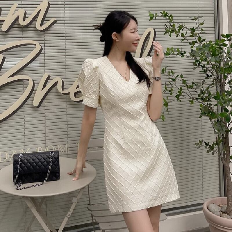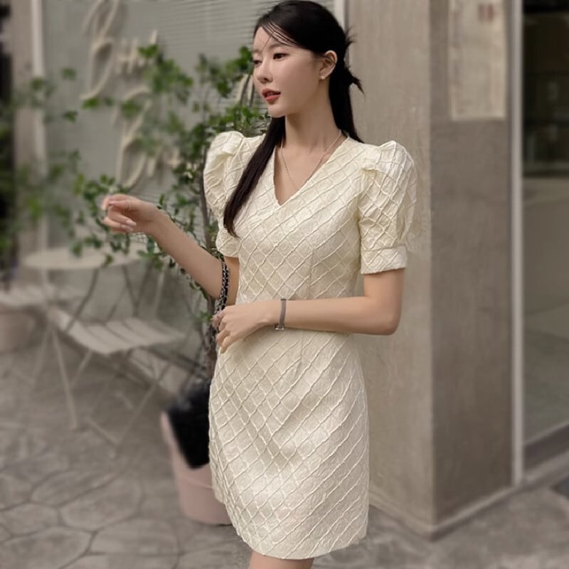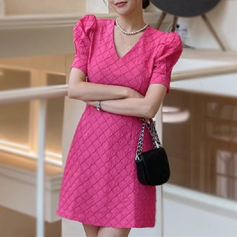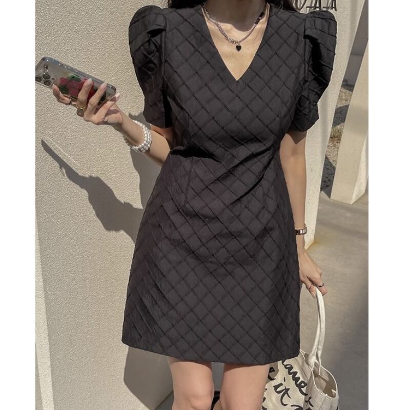 ワンピース 3色展開 パフスリーブ Vネック ローズ色 ベージュ ブラック S M L XL