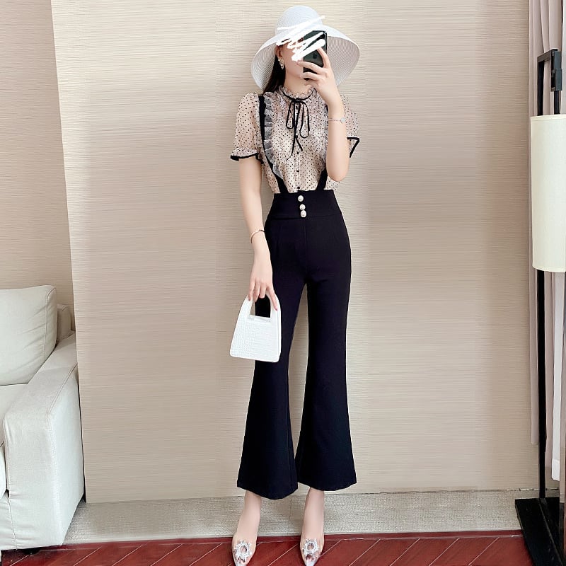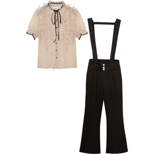 セットアップ OL/通勤 ドット柄 シフォン パプラム シャツ+パンツ ブラック S M L XL