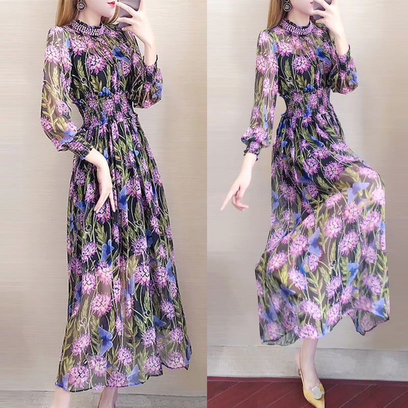ワンピース 気質UP 花柄 シフォン エレガント 長袖 大振裾 パープル S M L XL