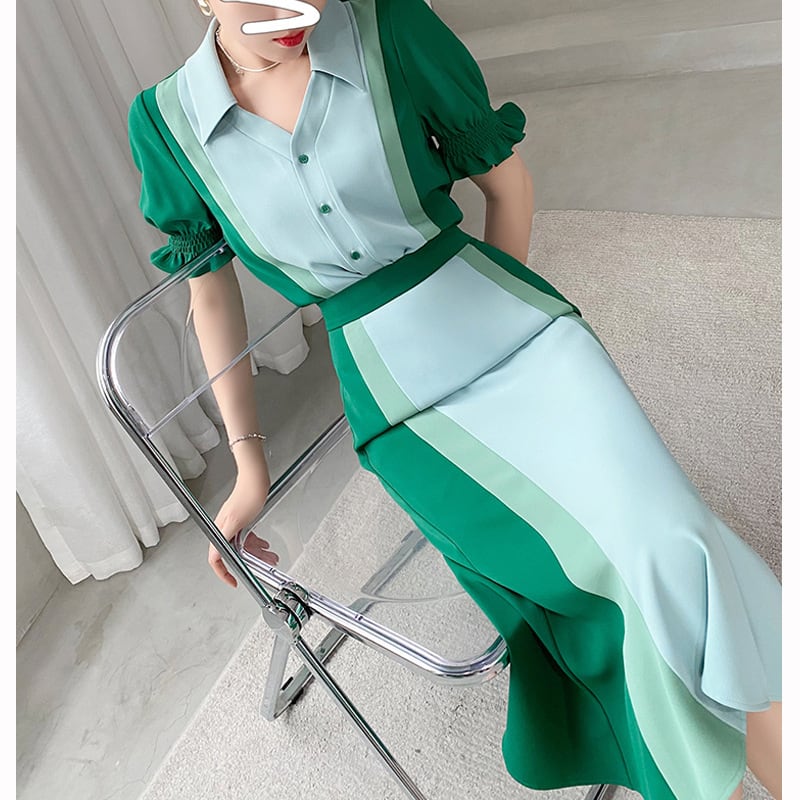 セットアップ チャーミング OL/通勤 Vネック 切り替え 配色 シフォン トップス+スカート グリーン S M L XL