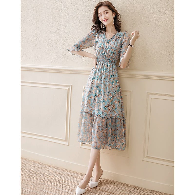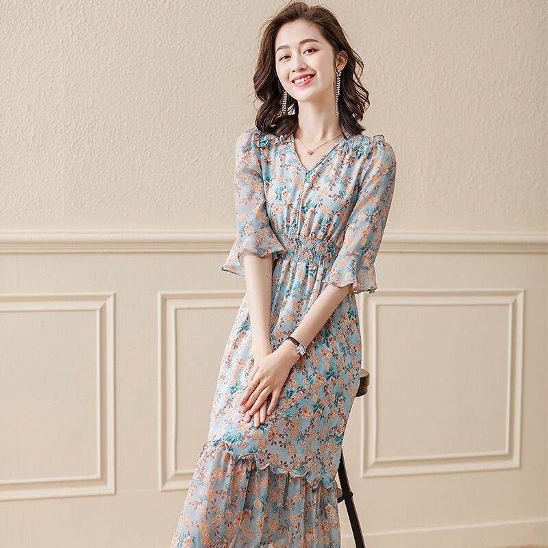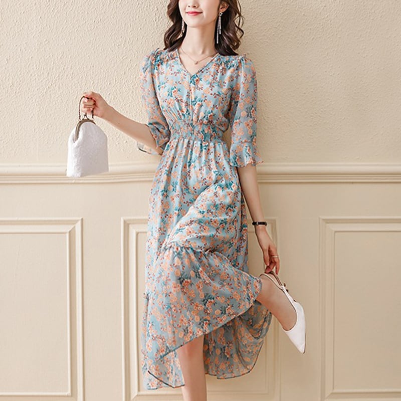 ワンピース シフォン 花柄 オシャレ 文芸風 清新 Vネック パプラム ブルー S M L XL