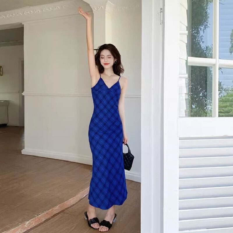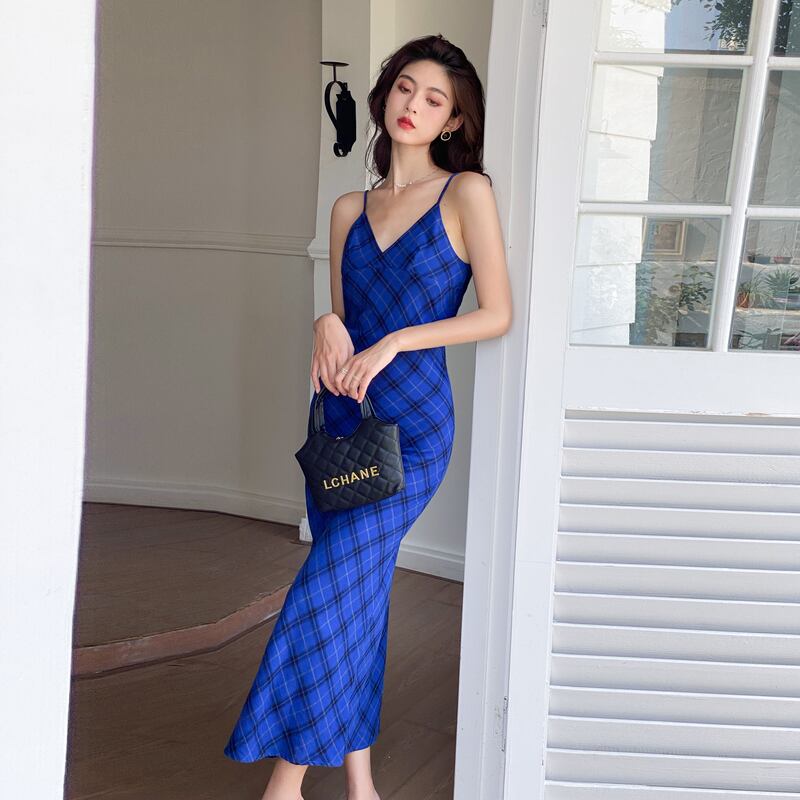【ELEGANTSSシリーズ】吊りワンピース Vネック フィッシュテール ブルー S M L XL