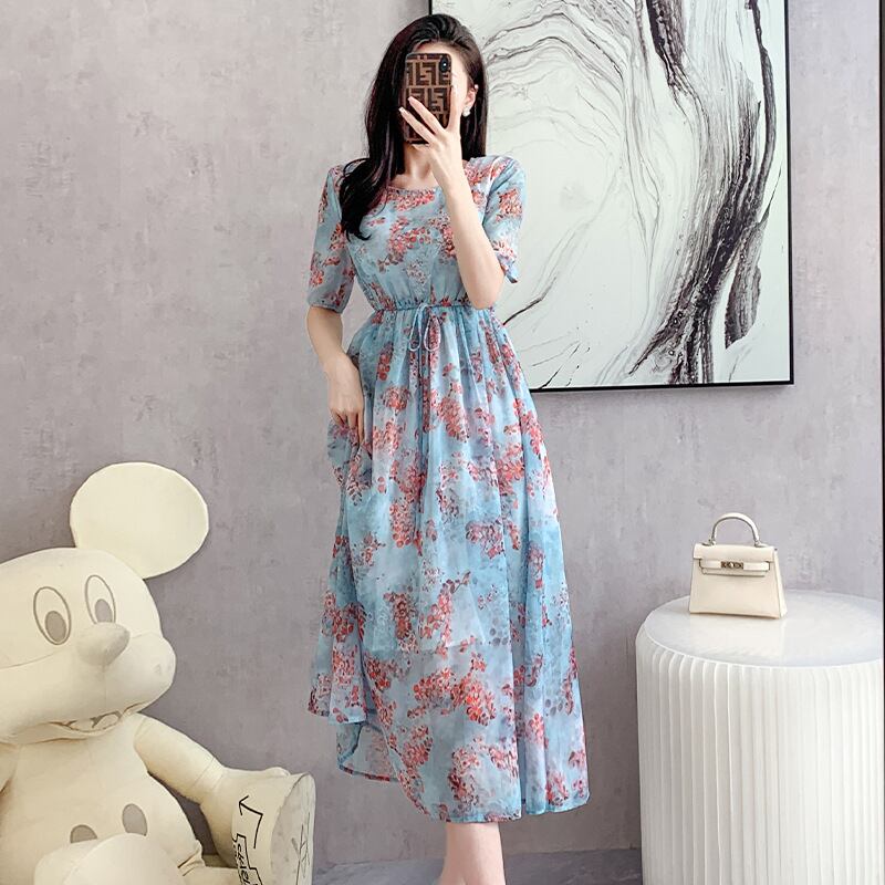ワンピース OL/通勤 花柄 パプラム シフォン ロング丈 大きいサイズ ブルー S M L XL 2XL 3XL