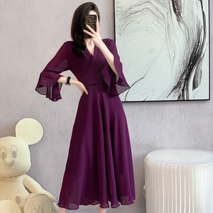 ワンピース OL/通勤 Vネック 花柄 パプラム シフォン ロング丈 大きいサイズ パープル M L XL 2XL 3XL 4XL