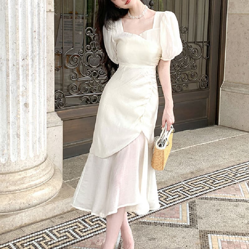 【ELEGANTSSシリーズ】ワンピース 2色展開 パフスリーブ エレガント ベージュ ブラック S M L XL