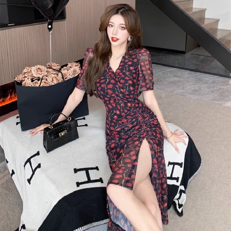 【CHERRYシリーズ】ワンピース 花柄 Vネック 綺麗め スリット プリント S M L