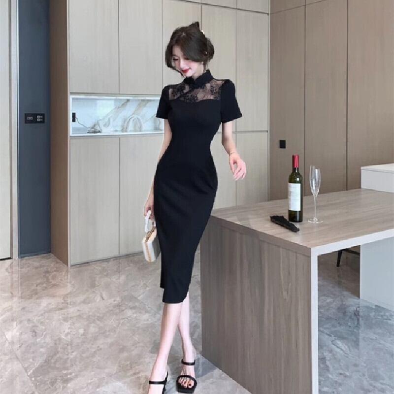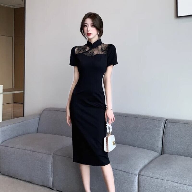 【CHERRYシリーズ】チャイナ風ワンピース 気質満点 レース 無地 ブラック S M L